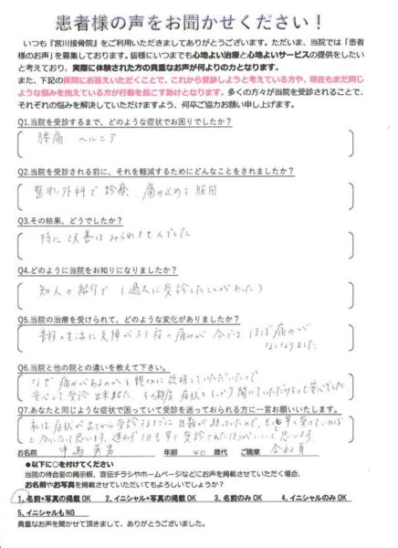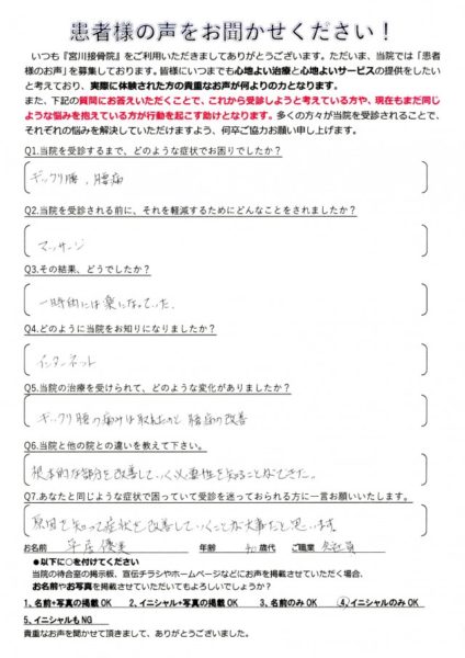 痛み止めを服用していましたが特に改善はみられなかったので知人からの紹介で宮川接骨院に通うことになりました。