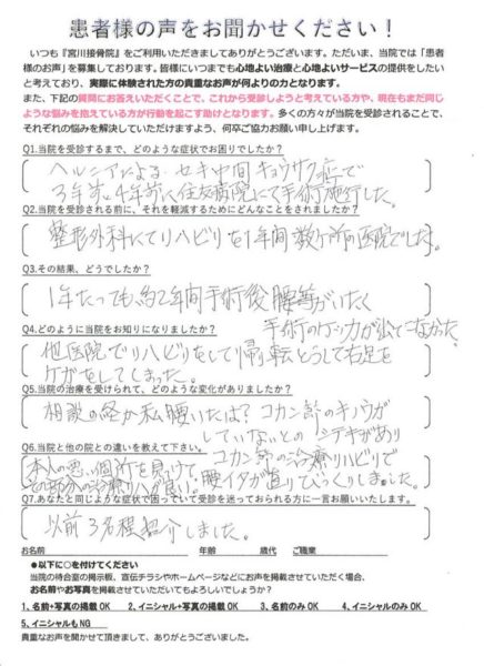脊柱管狭窄症の手術をしそれでも痛みが取れなかった痛みを改善さしてくれました