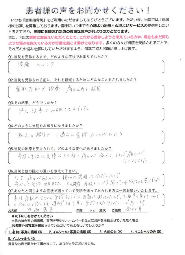 今では普段の生活でさえ支障があった痛みがほぼなくなるところまで改善しています。